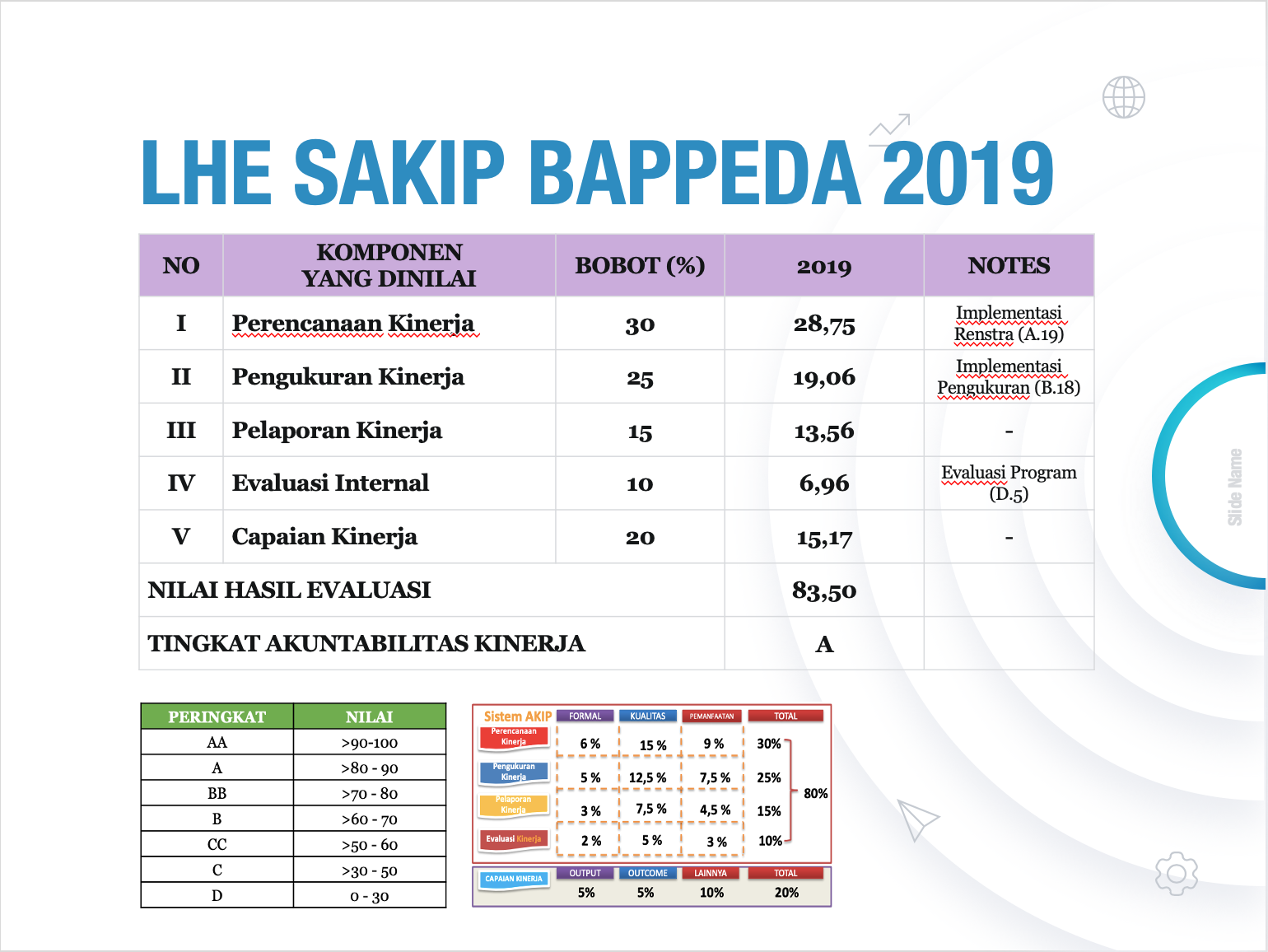 Berdasarkan Laporan Hasil Evaluasi (LHE) Inspektorat Kabupaten Sumbawa terhadap Laporan Akuntabilitas Kinerja Instansi Pemerintah (LAKIP) Badan Perencanaan Pembangunan Penelitian dan Pengembangan Daerah (BAPPEDA) Tahun Anggaran 2019, mencatatkan nilai "A" yang merupakan pencapaian yang relatif prestisius bagi Perangkat Daerah dalam menyelenggarakan tugas dan fungsinya.